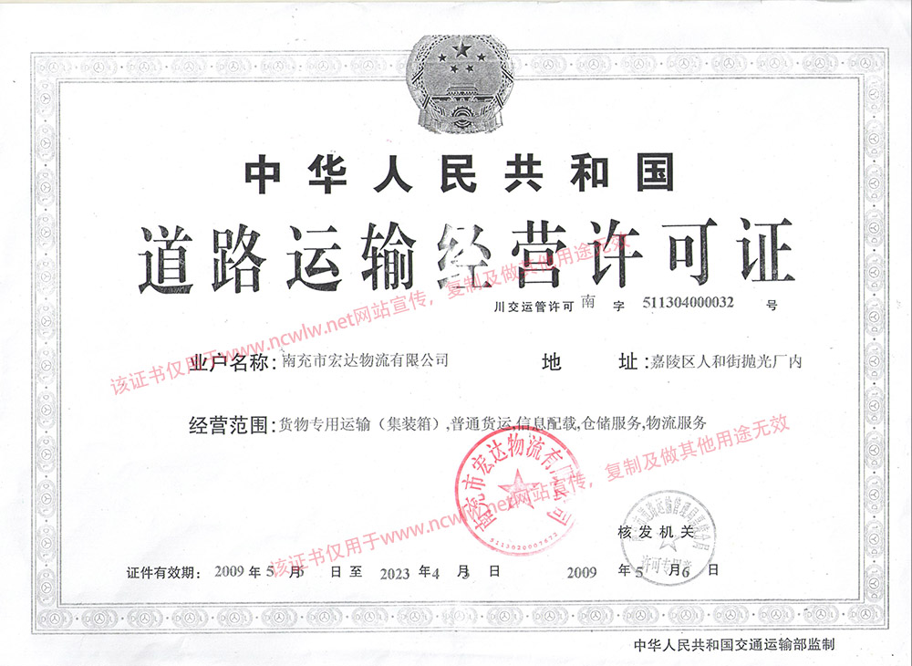 南充物流網(wǎng)(m.jixie900.com) 南充市宏達物流有限公司道路運輸經(jīng)營許可證